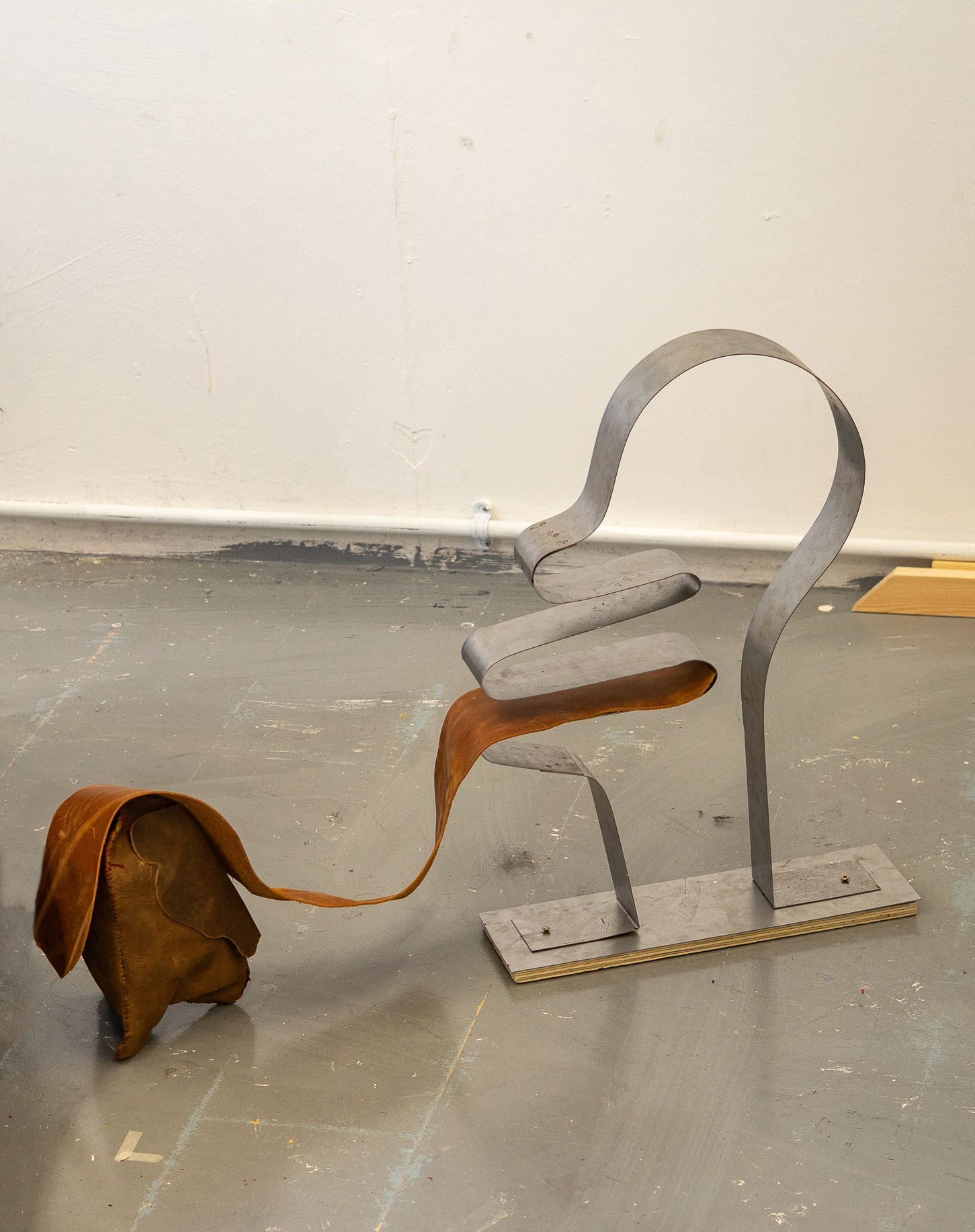 Wobble pt. 1. Steel, wood, leather hide, thread. November 2025.